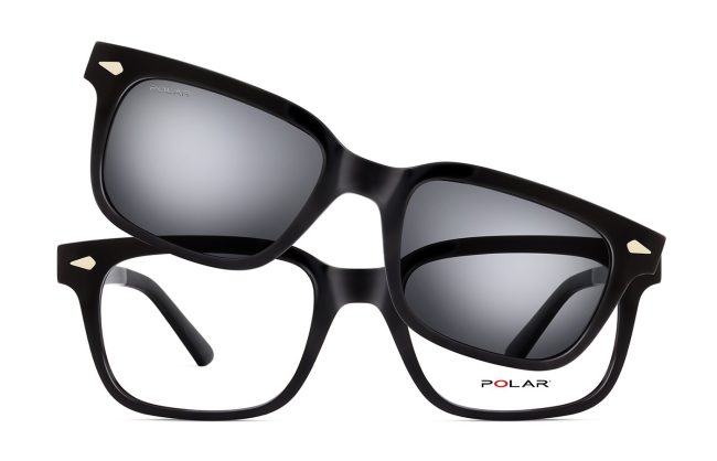 Montura de la marca POLAR,  fabricada en Ultem, lo que la fonfiere ligereza de porte. se suministra con clip solar  polarizado, adherido con imanes a la montura. Código 5717. Medidas 55×18.